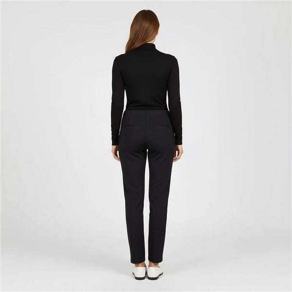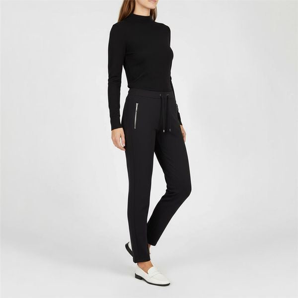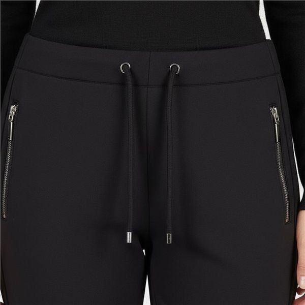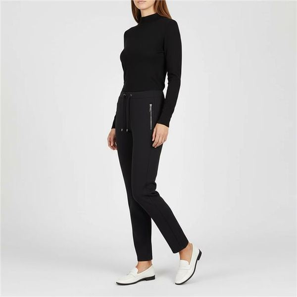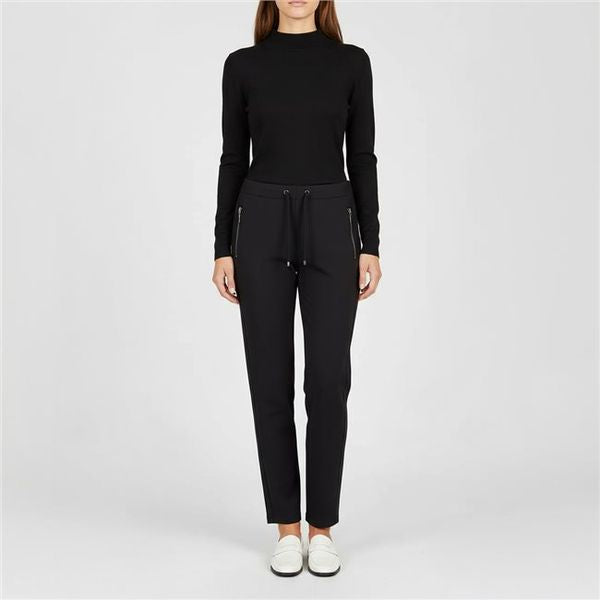 These black trousers combine comfort and style in a modern, versatile design. Crafted from a soft and stretchy fabric blend of 65% Viscose, 31% Polyamide, and 4% Elastane, they offer a flattering, flexible fit. The front features a drawstring waistband and zip pockets for a sporty touch, while the back includes subtle welt-style details for a tailored finish. With a slim straight leg cut, these trousers effortlessly balance ease and elegance—ideal for both casual and smart-casual styling.