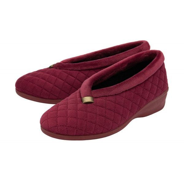 The Lotus women’s Eadie slipper is a classic style that will be appreciated by the sophisticated lady.  This burgundy full shoe slipper boasts a quilted effect imi-suede upper that is finished with a short plush trim and lining for additional warmth.  Resting on an outdoor sole unit with a subtle wedge heel and boasting a memory foam insock, this traditional women’s slipper is a highly wearable style that is effortless to slip on and off.